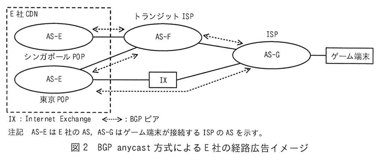 E社BGP anycast方式では、同じアドレスブロックを同じAS番号を用いてシンガポールPOP及び東京POPの両方からBGPで経路広告する。シンガポールPOPと東京POPの間は直接接続されていない。ゲーム端末が接続するISPでは,E社ASの経路情報を複数の隣接したASから受信する。どの経路情報を採用するかはBGPの経路選択アルゴリズムで決定される。ゲーム端末からのHTTPSリクエストのパケットは,決定された経路で隣接のASに転送される。